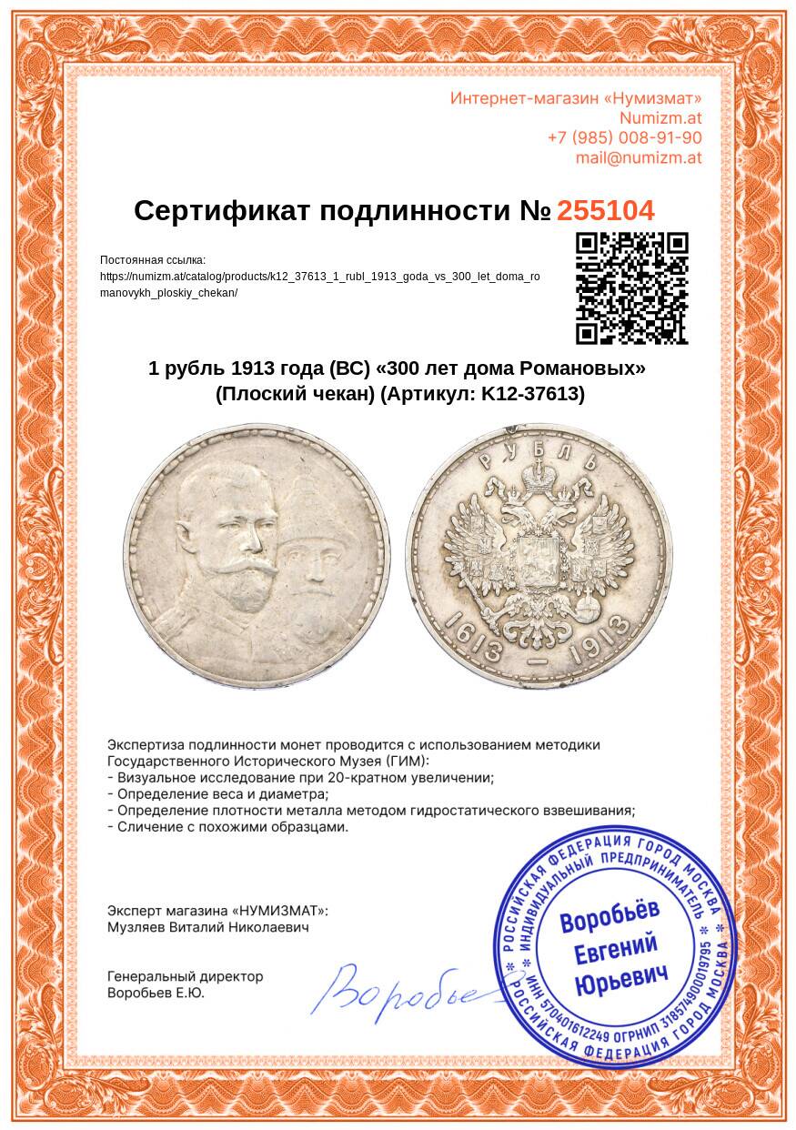 20.01.2025Интернет магазин «Нумизмат» предлагает приобрести 1 рубль 1913 года (ВС) «300 лет дома Романовых» (Плоский чекан).