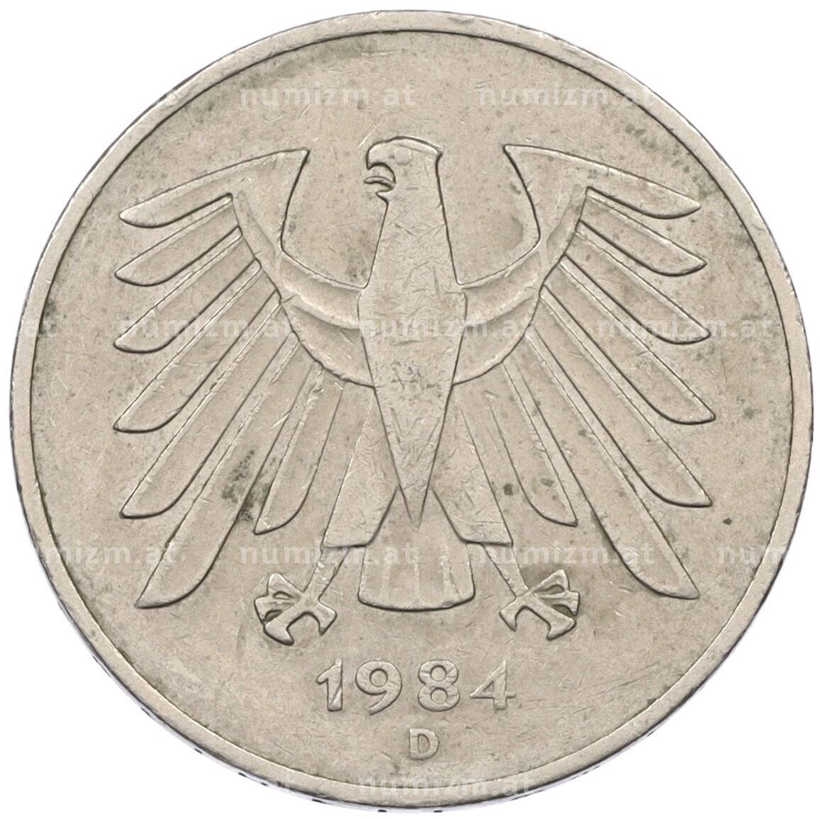 20.01.2025Интернет магазин «Нумизмат» предлагает приобрести 5 марок 1984 года D Западная Германия (ФРГ).
