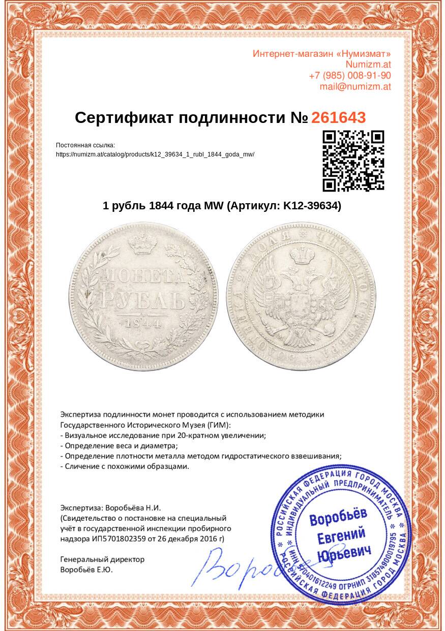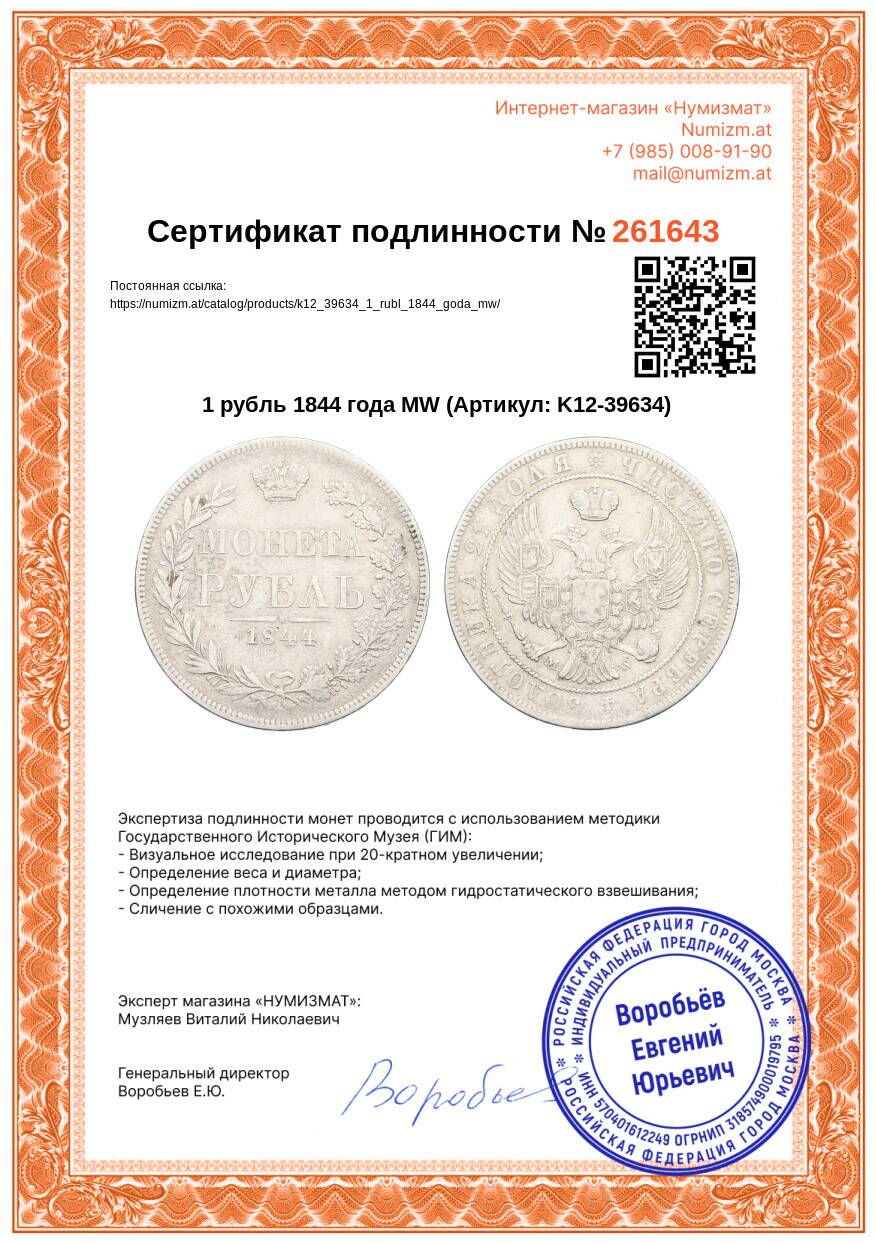 20.01.2025Интернет магазин «Нумизмат» предлагает приобрести 1 рубль 1844 года МW.