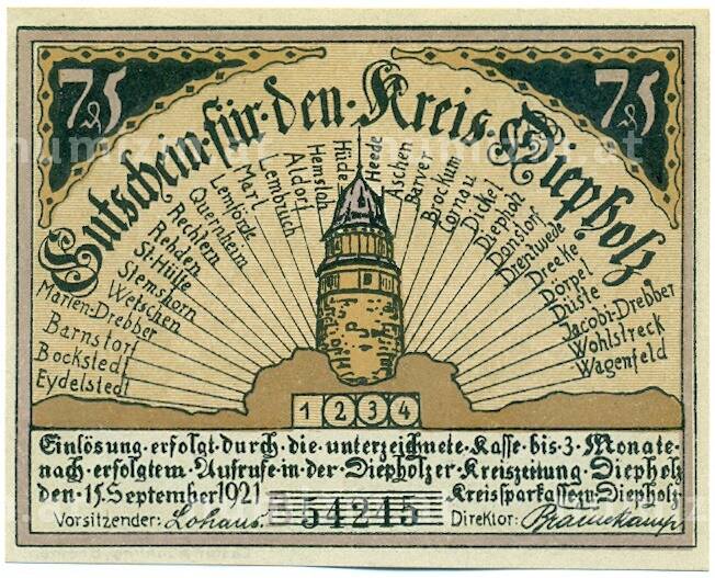 Купить 75 пфеннигов 1921 года Германия — город Дипхольц (Нотгельд) по привлекательной цене можно в нашем интернет-магазине — Вам достаточно оформить заказ на сайте. Все монеты, представленные в каталоге, находятся в наличии на нашем складе.