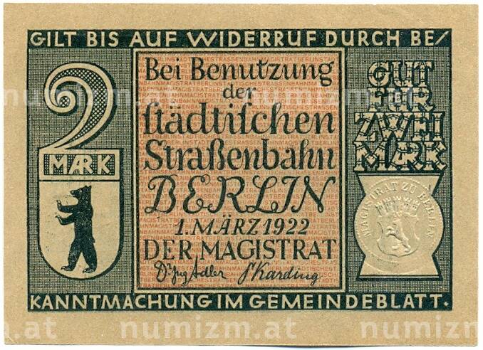 20.01.2025Интернет магазин «Нумизмат» предлагает приобрести 2 марки 1922 года Германия — город Берлин (Нотгельд).