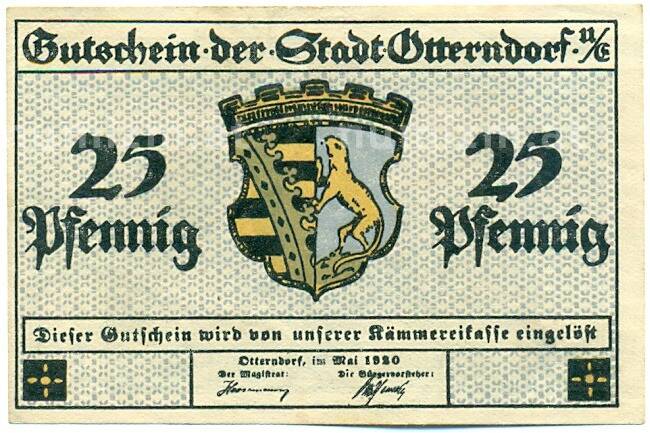 Купить 25 пфеннигов 1920 года Германия — город Оттерндорф (Нотгельд) по привлекательной цене можно в нашем интернет-магазине — Вам достаточно оформить заказ на сайте. Все монеты, представленные в каталоге, находятся в наличии на нашем складе.
