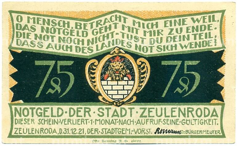 Купить 75 пфеннигов 1921 года Германия — город Цойленрода (Нотгельд) по привлекательной цене можно в нашем интернет-магазине — Вам достаточно оформить заказ на сайте. Все монеты, представленные в каталоге, находятся в наличии на нашем складе.