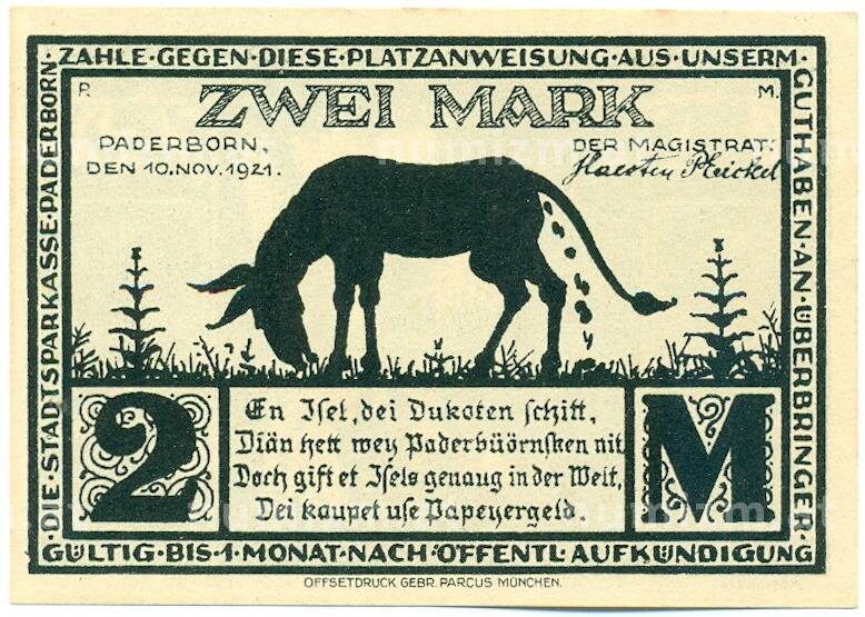 Банкнота 2 марки 1921 года Германия — город Падерборн (Нотгельд) (Артикул: K12-41741): подробные характеристики, качественные фотографии в высоком разрешении, низкая цена.