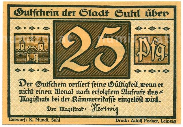Банкнота 25 пфеннигов 1921 года Германия — город Зуль (Нотгельд) (Артикул: K12-41749): подробные характеристики, качественные фотографии в высоком разрешении, низкая цена.
