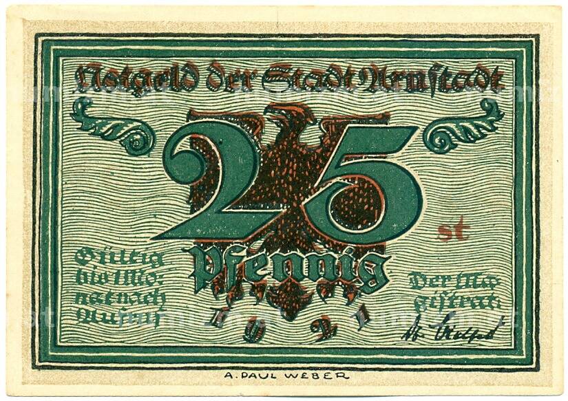 Купить 25 пфеннигов 1921 года Германия — город Арнштадт (Нотгельд) по привлекательной цене можно в нашем интернет-магазине — Вам достаточно оформить заказ на сайте. Все монеты, представленные в каталоге, находятся в наличии на нашем складе.