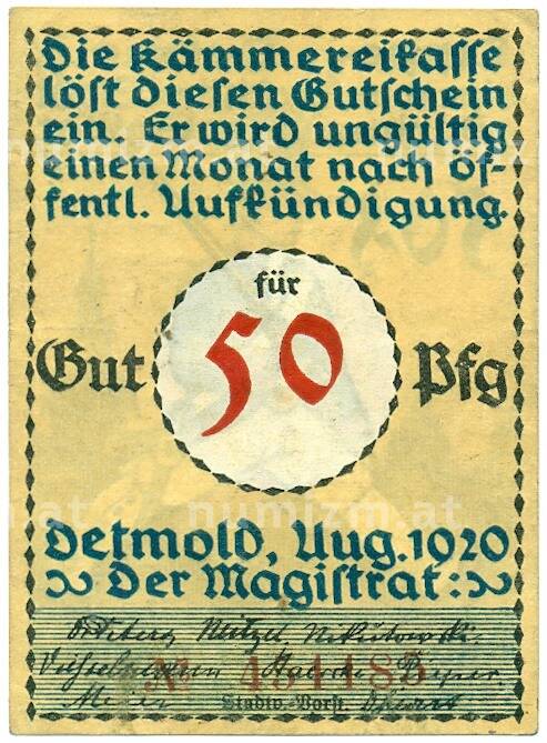 Купить 50 пфеннигов 1920 года Германия — город Детмольд (Нотгельд) по привлекательной цене можно в нашем интернет-магазине — Вам достаточно оформить заказ на сайте. Все монеты, представленные в каталоге, находятся в наличии на нашем складе.