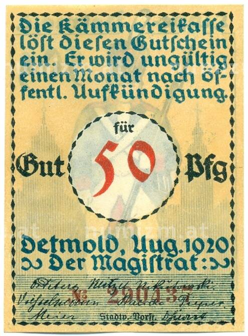 Купить 50 пфеннигов 1920 года Германия — город Детмольд (Нотгельд) по привлекательной цене можно в нашем интернет-магазине — Вам достаточно оформить заказ на сайте. Все монеты, представленные в каталоге, находятся в наличии на нашем складе.