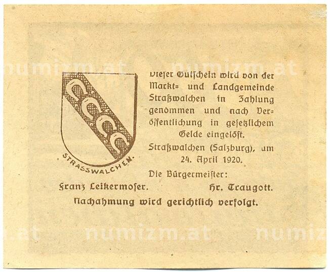 Купить 50 геллеров 1920 года Австрия — коммуна Штрасвальхен (Нотгельд) по привлекательной цене можно в нашем интернет-магазине — Вам достаточно оформить заказ на сайте. Все монеты, представленные в каталоге, находятся в наличии на нашем складе.
