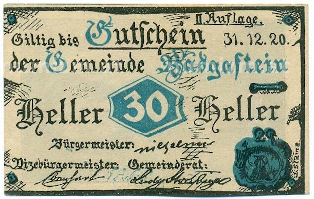 Купить 30 геллеров 1920 года Австрия — Бад-Гаштайн (Нотгельд) по привлекательной цене можно в нашем интернет-магазине — Вам достаточно оформить заказ на сайте. Все монеты, представленные в каталоге, находятся в наличии на нашем складе.