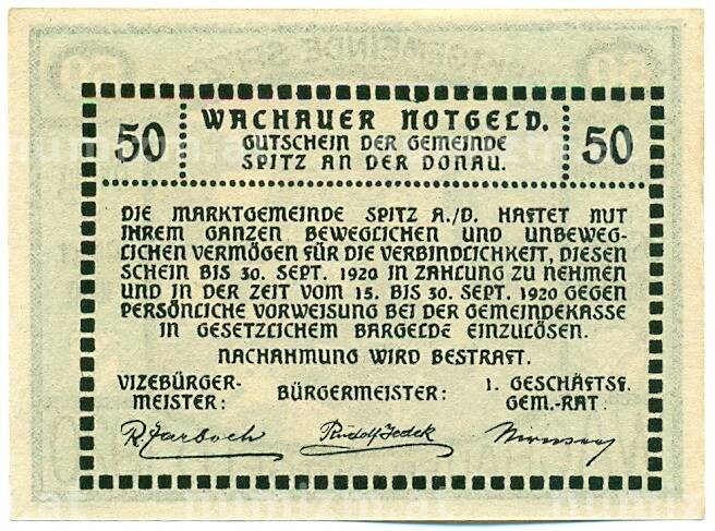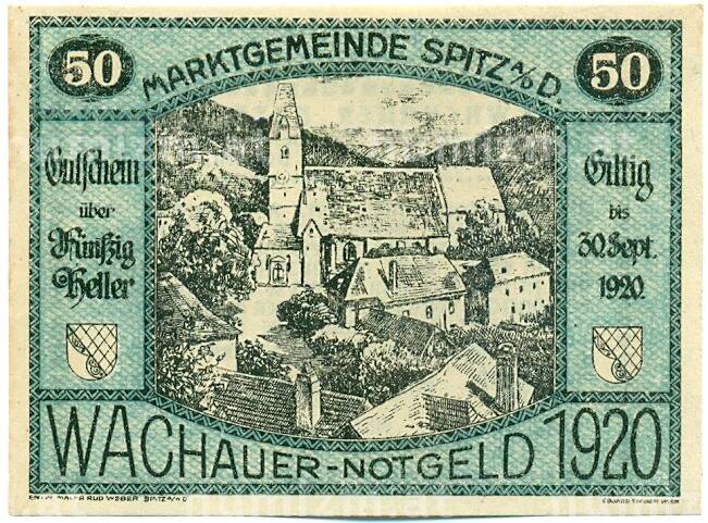 Банкнота 50 геллеров 1920 года Австрия — Вахау (Нотгельд) (Артикул: K12-41837): подробные характеристики, качественные фотографии в высоком разрешении, низкая цена.
