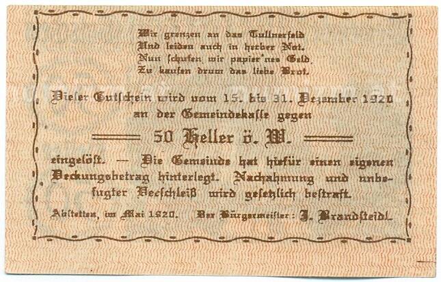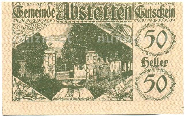 Купить 50 геллеров 1920 года Австрия — Абштеттен (Нотгельд) по привлекательной цене можно в нашем интернет-магазине — Вам достаточно оформить заказ на сайте. Все монеты, представленные в каталоге, находятся в наличии на нашем складе.