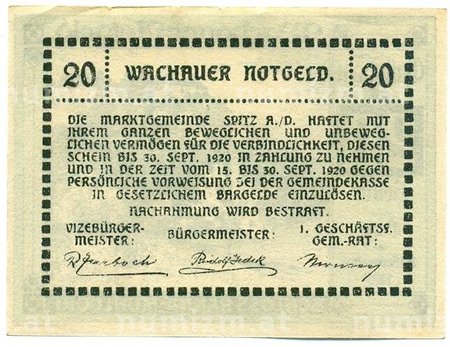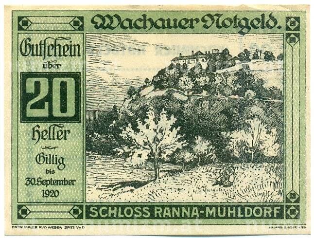 Банкнота 20 геллеров 1920 года Австрия — Вахау (Нотгельд) (Артикул: K12-41846): подробные характеристики, качественные фотографии в высоком разрешении, низкая цена.