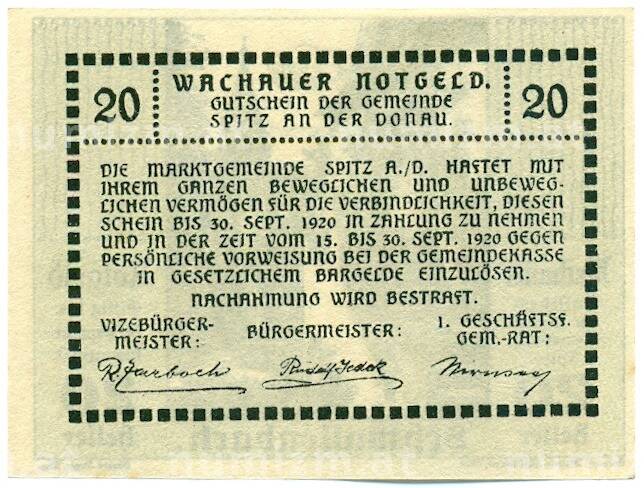 Банкнота 20 геллеров 1920 года Австрия — Вахау (Нотгельд) (Артикул: K12-41849): подробные характеристики, качественные фотографии в высоком разрешении, низкая цена.