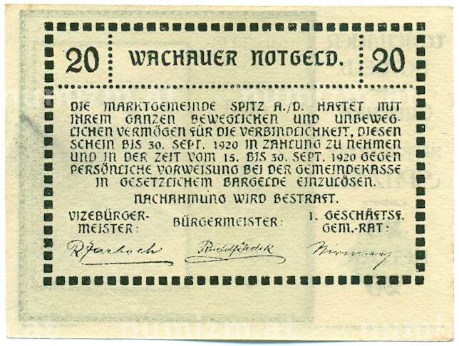 Банкнота 20 геллеров 1920 года Австрия — Вахау (Нотгельд) (Артикул: K12-41858): подробные характеристики, качественные фотографии в высоком разрешении, низкая цена.