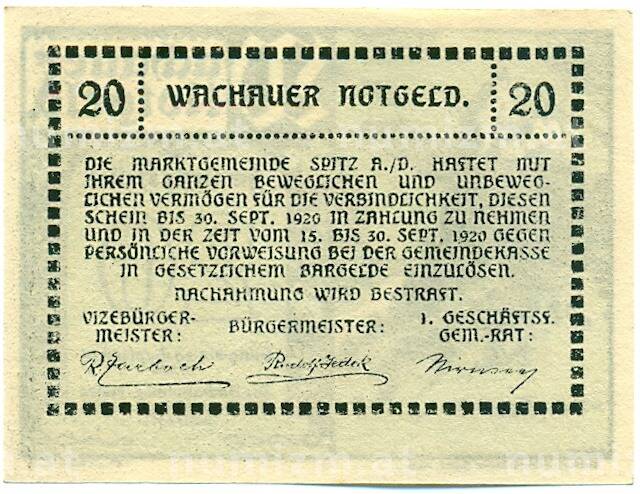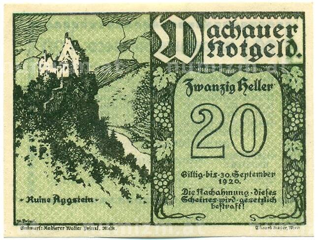 Банкнота 20 геллеров 1920 года Австрия — Вахау (Нотгельд) (Артикул: K12-41864): подробные характеристики, качественные фотографии в высоком разрешении, низкая цена.