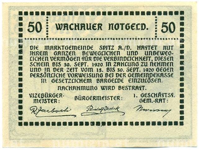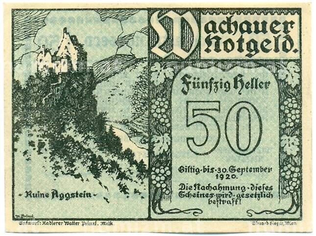 Банкнота 50 геллеров 1920 года Австрия — Вахау (Нотгельд) (Артикул: K12-41865): подробные характеристики, качественные фотографии в высоком разрешении, низкая цена.