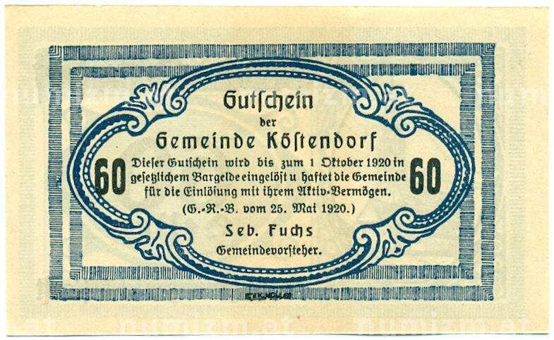 Купить 60 геллеров 1920 года Австрия — коммуна Кестендорф (Нотгельд) по привлекательной цене можно в нашем интернет-магазине — Вам достаточно оформить заказ на сайте. Все монеты, представленные в каталоге, находятся в наличии на нашем складе.