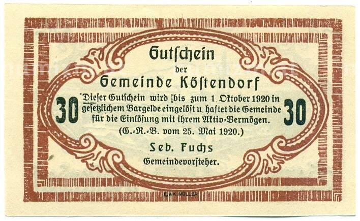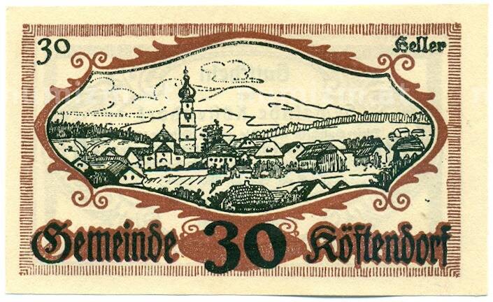 Купить 30 геллеров 1920 года Австрия — коммуна Кестендорф (Нотгельд) по привлекательной цене можно в нашем интернет-магазине — Вам достаточно оформить заказ на сайте. Все монеты, представленные в каталоге, находятся в наличии на нашем складе.