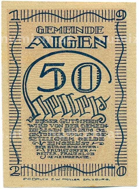 Купить 50 геллеров 1920 года Австрия — коммуна Айген (Нотгельд) по привлекательной цене можно в нашем интернет-магазине — Вам достаточно оформить заказ на сайте. Все монеты, представленные в каталоге, находятся в наличии на нашем складе.