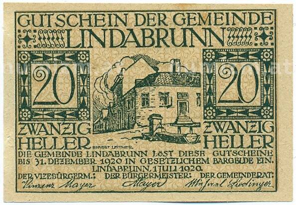 Купить 20 геллеров 1920 года Австрия — община Линдабрунн (Нотгельд) по привлекательной цене можно в нашем интернет-магазине — Вам достаточно оформить заказ на сайте. Все монеты, представленные в каталоге, находятся в наличии на нашем складе.