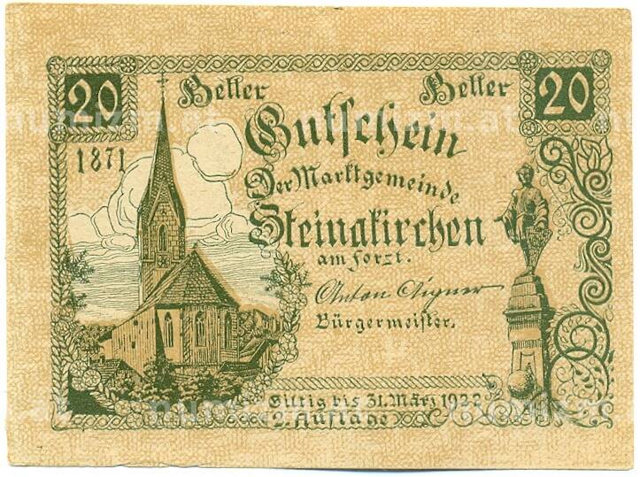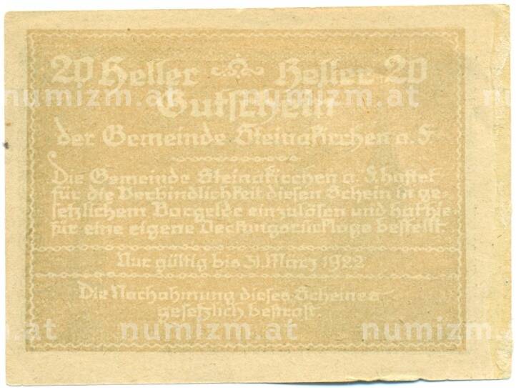 Купить 20 геллеров 1922 года Австрия — коммуна Штайнакирхен-ам-Форст (Нотгельд) по привлекательной цене можно в нашем интернет-магазине — Вам достаточно оформить заказ на сайте. Все монеты, представленные в каталоге, находятся в наличии на нашем складе.