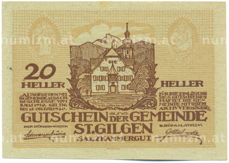 Купить 20 геллеров 1920 года Австрия — коммуна Санкт-Гильген (Нотгельд) по привлекательной цене можно в нашем интернет-магазине — Вам достаточно оформить заказ на сайте. Все монеты, представленные в каталоге, находятся в наличии на нашем складе.