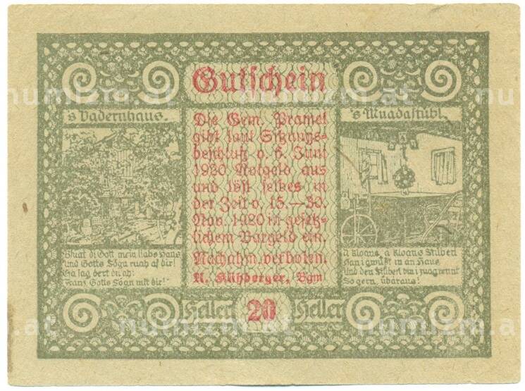 Купить 20 геллеров 1920 года Австрия — община Прамет (Нотгельд) по привлекательной цене можно в нашем интернет-магазине — Вам достаточно оформить заказ на сайте. Все монеты, представленные в каталоге, находятся в наличии на нашем складе.