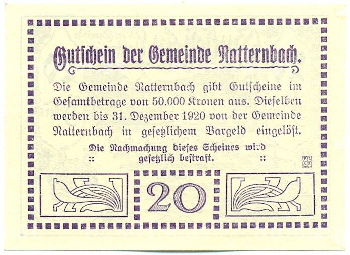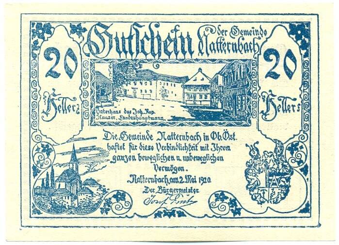 Купить 20 геллеров 1920 года Австрия — коммуна Наттернбах (Нотгельд) по привлекательной цене можно в нашем интернет-магазине — Вам достаточно оформить заказ на сайте. Все монеты, представленные в каталоге, находятся в наличии на нашем складе.