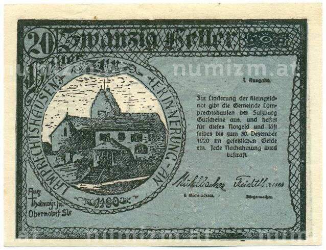 Купить 20 геллеров 1920 года Австрия — коммуна Лампрехтсхаузен (Нотгельд) по привлекательной цене можно в нашем интернет-магазине — Вам достаточно оформить заказ на сайте. Все монеты, представленные в каталоге, находятся в наличии на нашем складе.