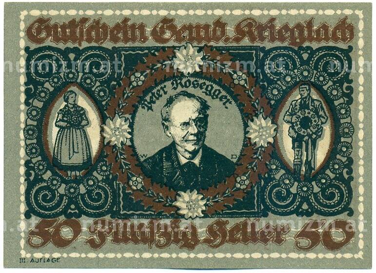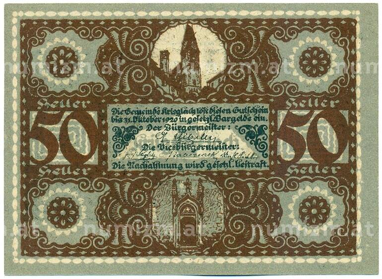 Банкнота 50 геллеров 1920 года Австрия — коммуна Криглах (Нотгельд) (Артикул: K12-42092): подробные характеристики, качественные фотографии в высоком разрешении, низкая цена.
