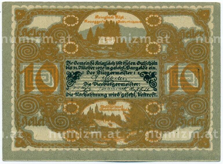 Купить 10 геллеров 1920 года Австрия — коммуна Криглах (Нотгельд) по привлекательной цене можно в нашем интернет-магазине — Вам достаточно оформить заказ на сайте. Все монеты, представленные в каталоге, находятся в наличии на нашем складе.
