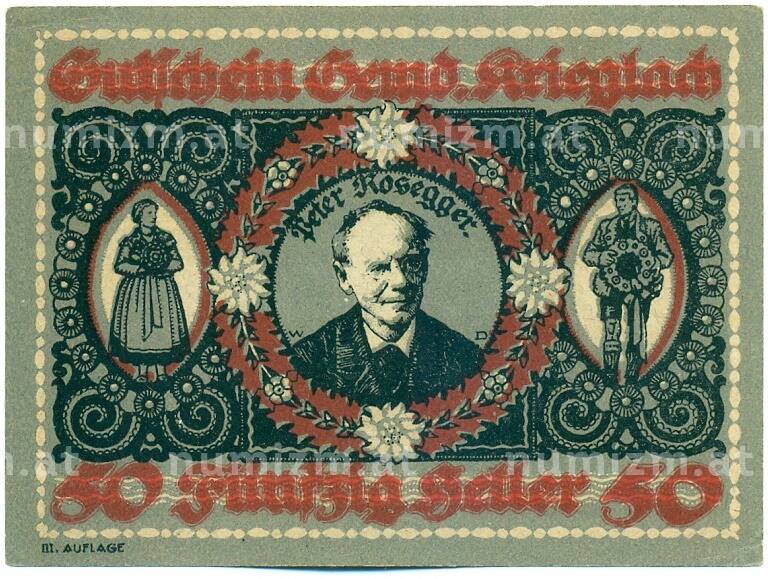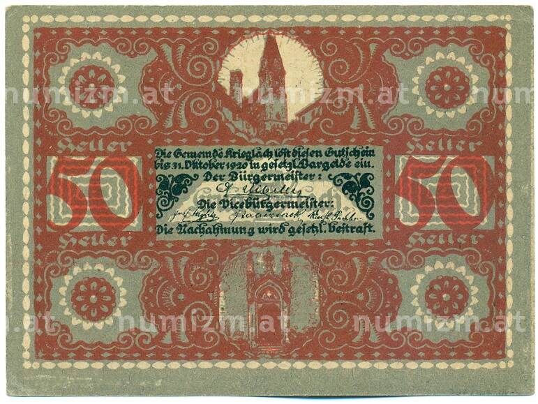 Банкнота 50 геллеров 1920 года Австрия — коммуна Криглах (Нотгельд) (Артикул: K12-42096): подробные характеристики, качественные фотографии в высоком разрешении, низкая цена.