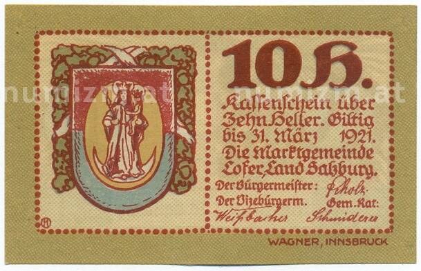 Купить 10 геллеров 1921 года Австрия — коммуна Лофер (Нотгельд) по привлекательной цене можно в нашем интернет-магазине — Вам достаточно оформить заказ на сайте. Все монеты, представленные в каталоге, находятся в наличии на нашем складе.