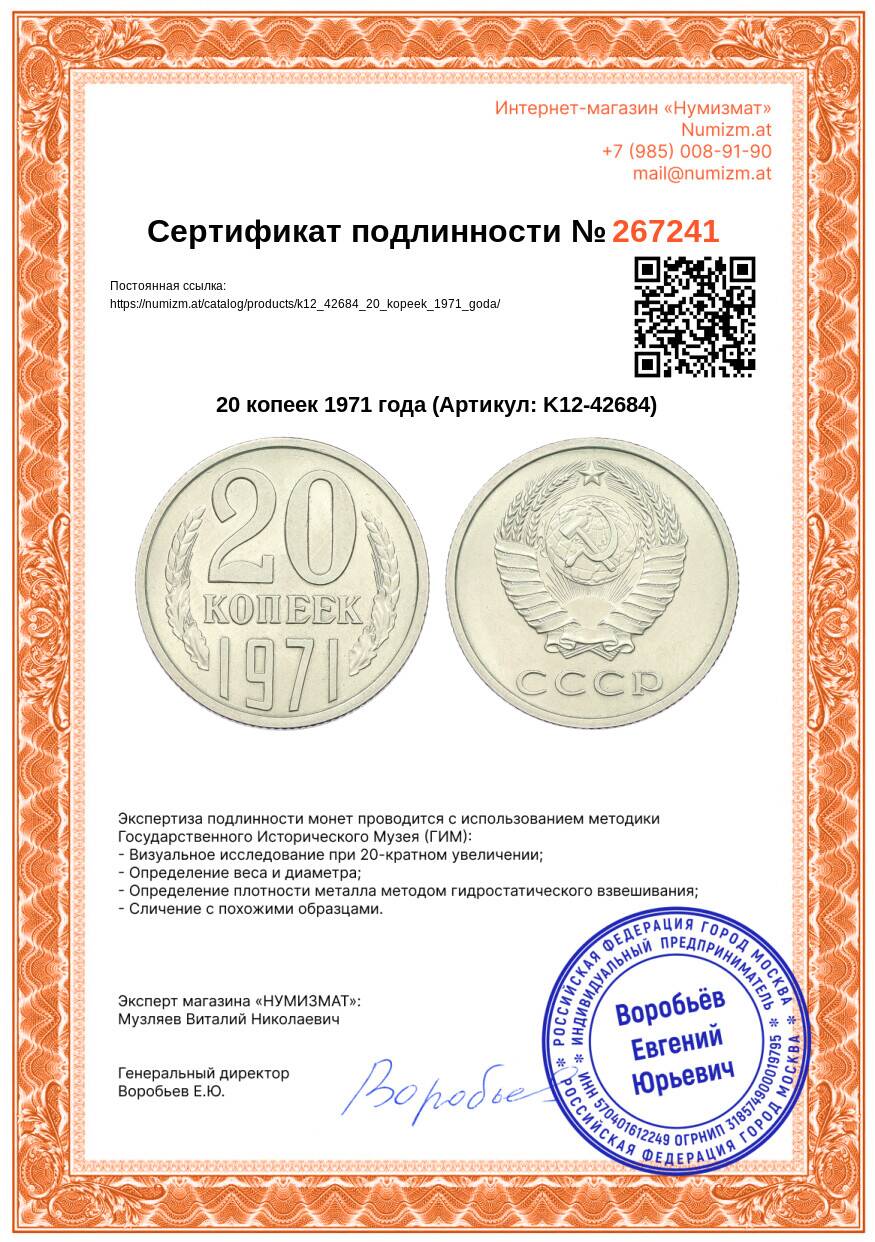 Монета 20 копеек 1971 года (Артикул: K12-42684): подробные характеристики, качественные фотографии в высоком разрешении, низкая цена.