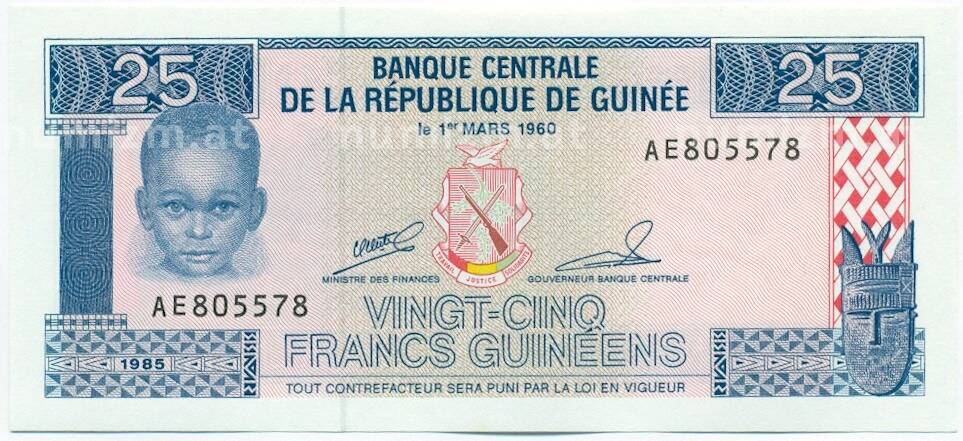 20.01.2025Интернет магазин «Нумизмат» предлагает приобрести 25 франков 1985 года Гвинея.