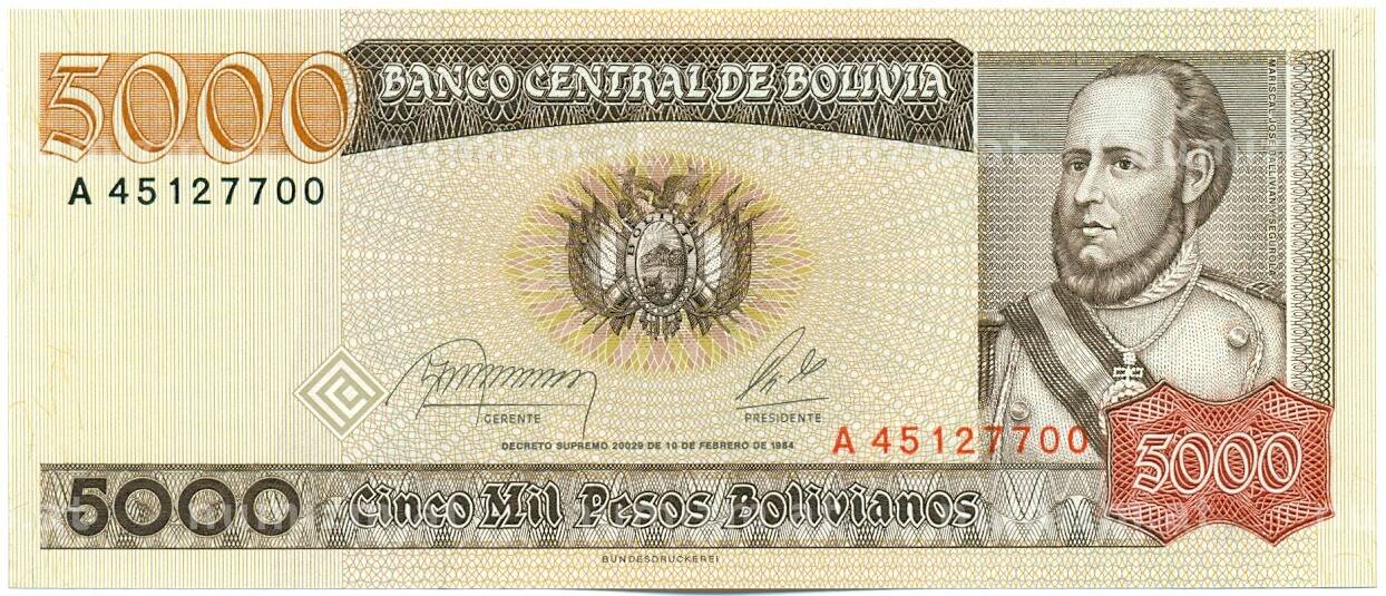Купить 5000 песо 1984 года Боливия по привлекательной цене можно в нашем интернет-магазине — Вам достаточно оформить заказ на сайте. Все монеты, представленные в каталоге, находятся в наличии на нашем складе.