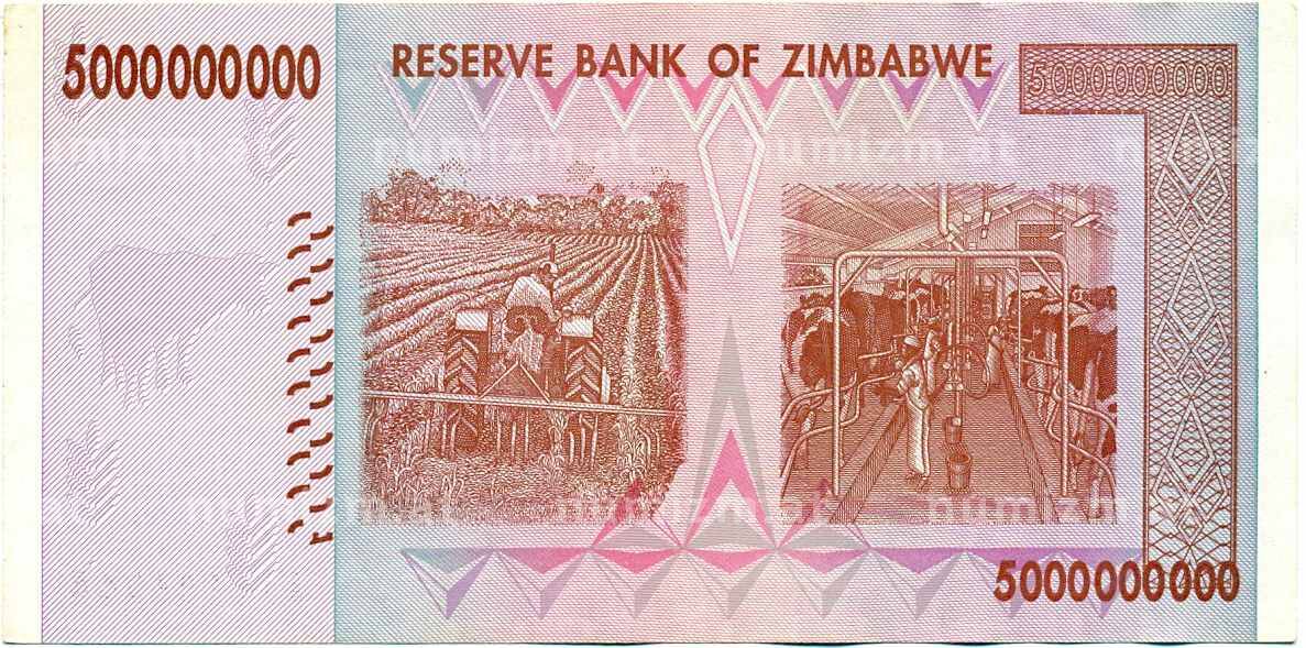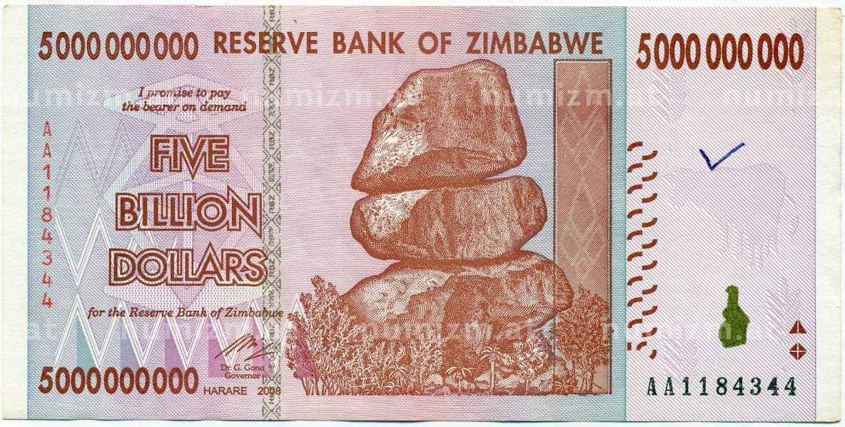 • Банкнота 5 миллиардов долларов 2008 года Зимбабве (Артикул: K12-56780) — Фото №1 Банкнота 5 миллиардов долларов 2008 года Зимбабве (Артикул: K12-56780) — Фото №2