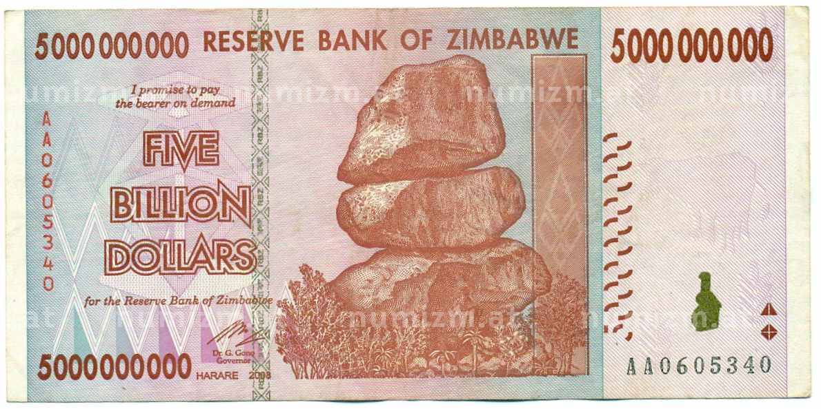 • Банкнота 5 миллиардов долларов 2008 года Зимбабве (Артикул: K12-57001) — Фото №1 Банкнота 5 миллиардов долларов 2008 года Зимбабве (Артикул: K12-57001) — Фото №2
