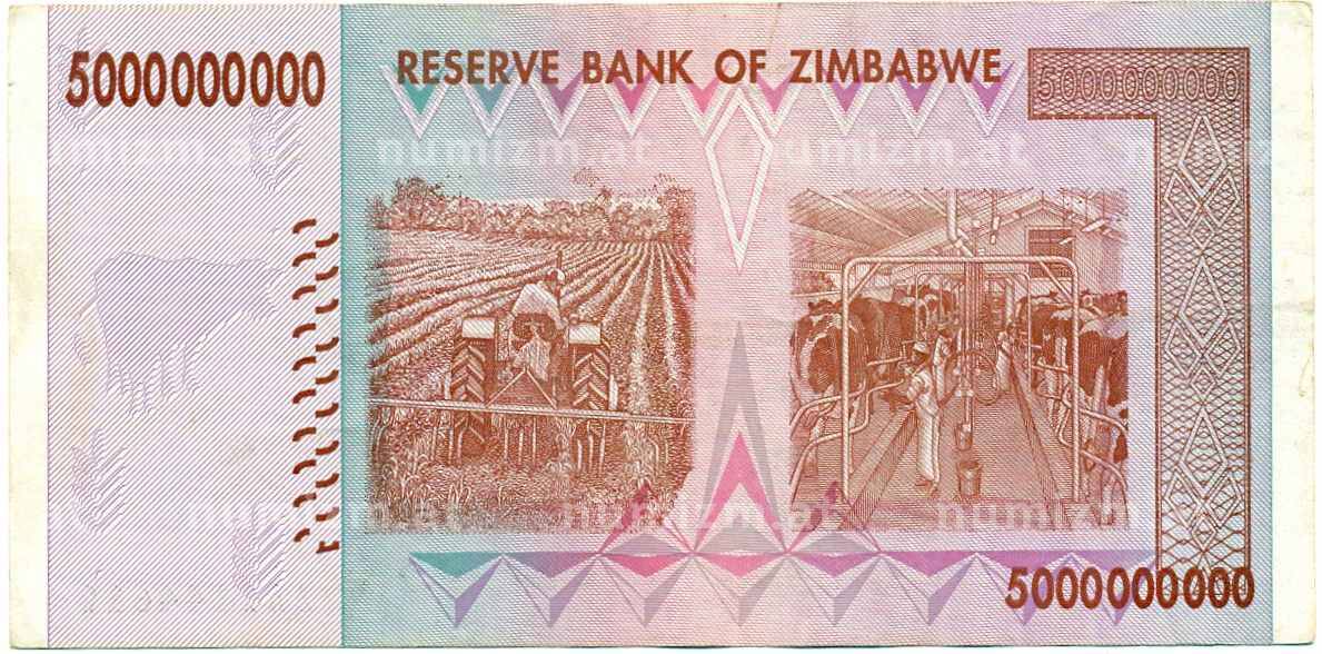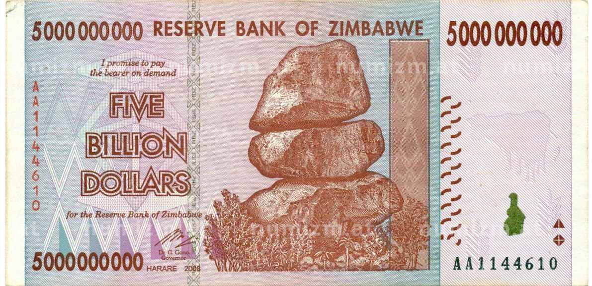 • Банкнота 5 миллиардов долларов 2008 года Зимбабве (Артикул: K12-57054) — Фото №1 Банкнота 5 миллиардов долларов 2008 года Зимбабве (Артикул: K12-57054) — Фото №2