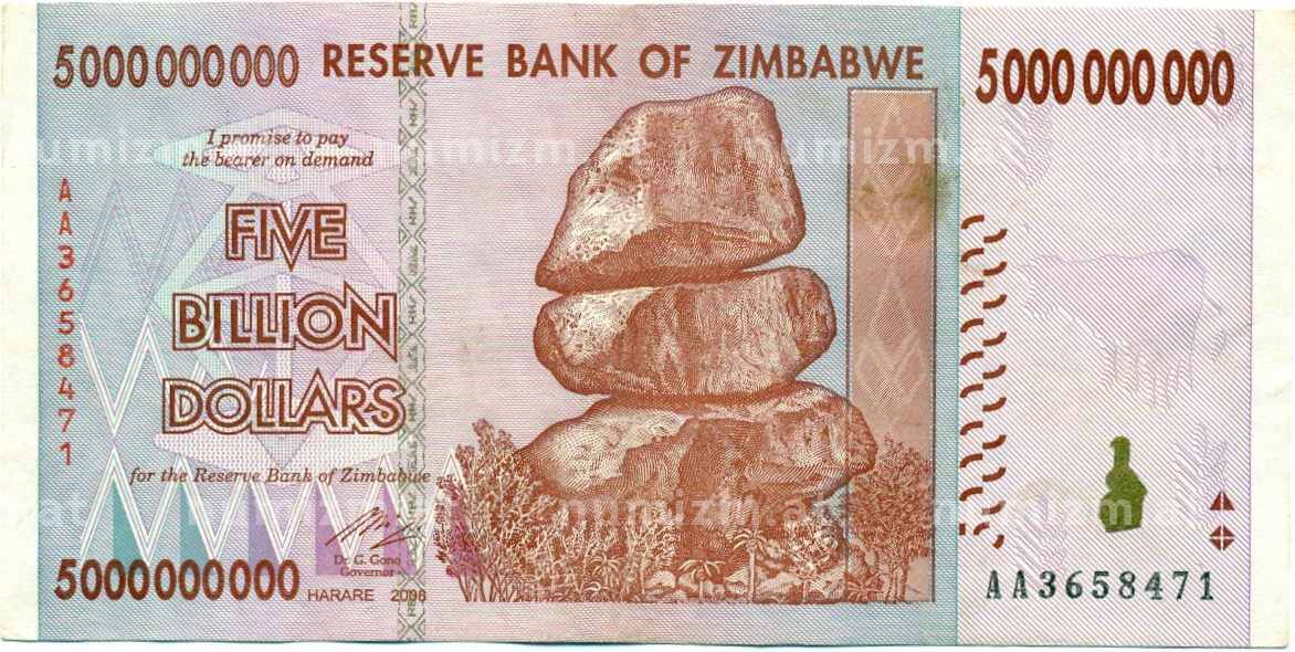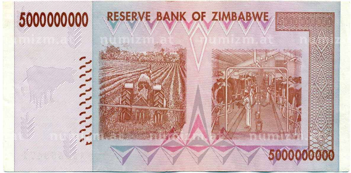 • Банкнота 5 миллиардов долларов 2008 года Зимбабве (Артикул: K12-57058) — Фото №1 Банкнота 5 миллиардов долларов 2008 года Зимбабве (Артикул: K12-57058) — Фото №2