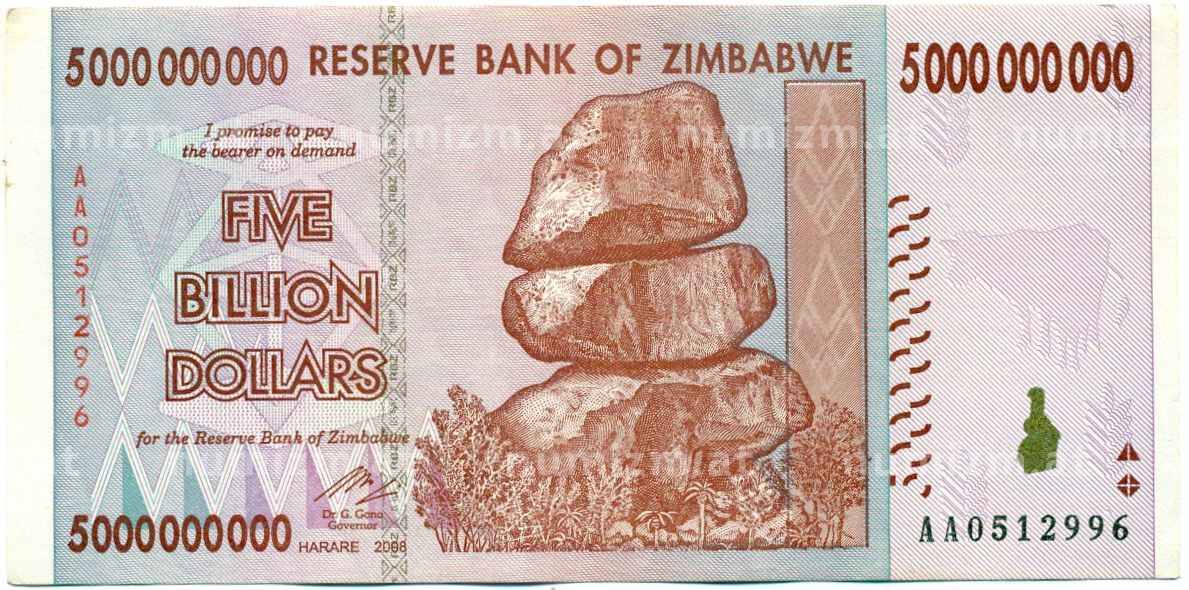 • Банкнота 5 миллиардов долларов 2008 года Зимбабве (Артикул: K12-57066) — Фото №1 Банкнота 5 миллиардов долларов 2008 года Зимбабве (Артикул: K12-57066) — Фото №2