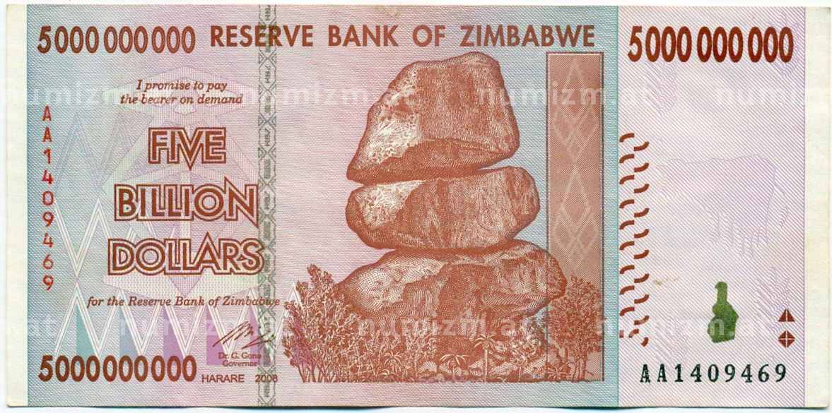 • Банкнота 5 миллиардов долларов 2008 года Зимбабве (Артикул: K12-57070) — Фото №1 Банкнота 5 миллиардов долларов 2008 года Зимбабве (Артикул: K12-57070) — Фото №2