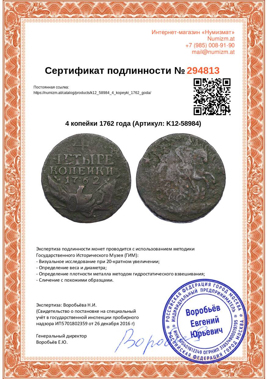 20.01.2025Интернет магазин «Нумизмат» предлагает приобрести 4 копейки 1762 года.