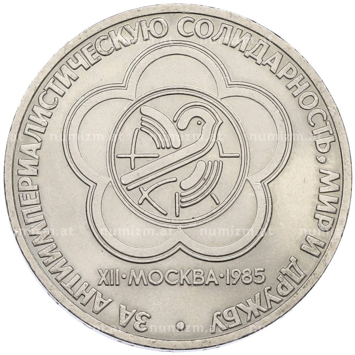 Купить 1 рубль 1985 года «XII Международный фестиваль молодежи и студентов в Москве» по привлекательной цене можно в нашем интернет-магазине — Вам достаточно оформить заказ на сайте. Все монеты, представленные в каталоге, находятся в наличии на нашем складе.