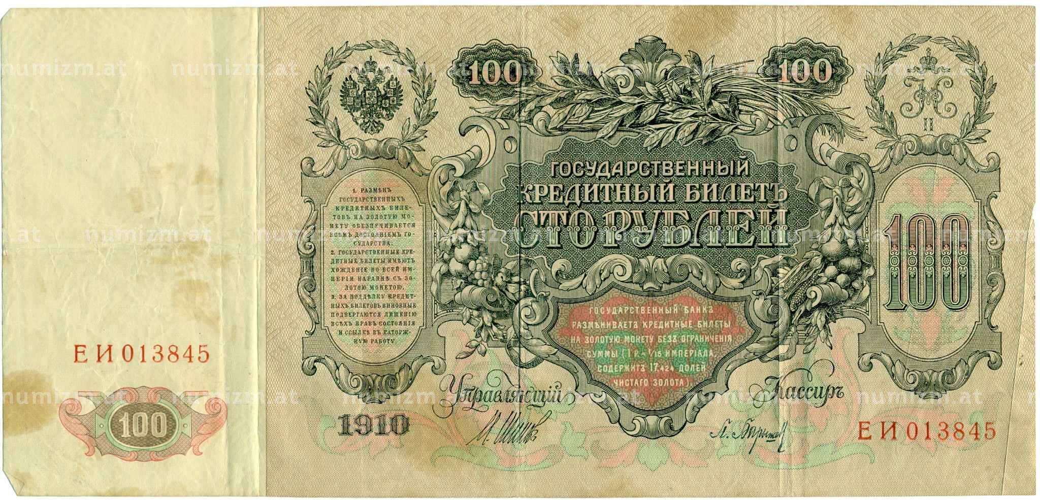 Купить 100 рублей 1910 года Шипов / Барышев по привлекательной цене можно в нашем интернет-магазине — Вам достаточно оформить заказ на сайте. Все монеты, представленные в каталоге, находятся в наличии на нашем складе.