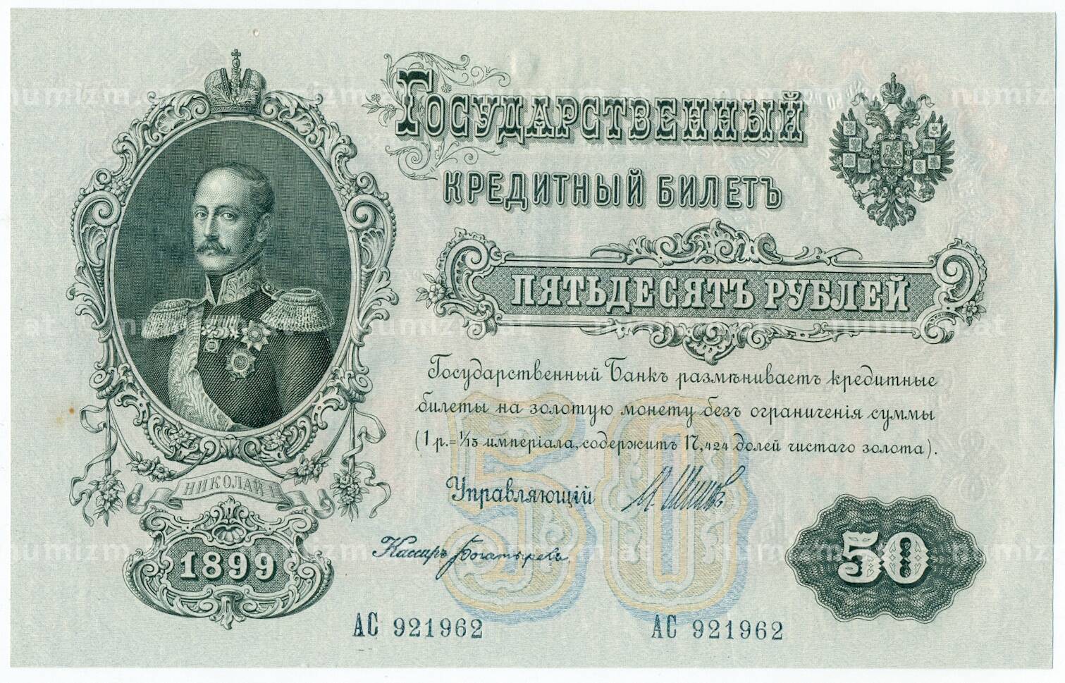 20.01.2025Интернет магазин «Нумизмат» предлагает приобрести 50 рублей 1899 года Шипов / Богатырев.
