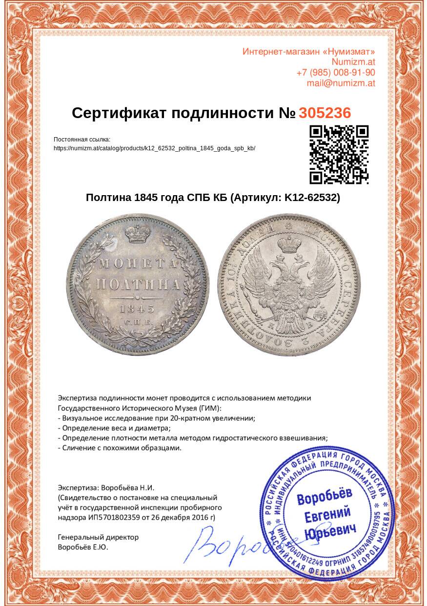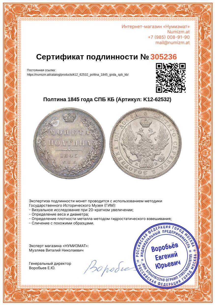 20.01.2025Интернет магазин «Нумизмат» предлагает приобрести Полтина 1845 года СПБ КБ.