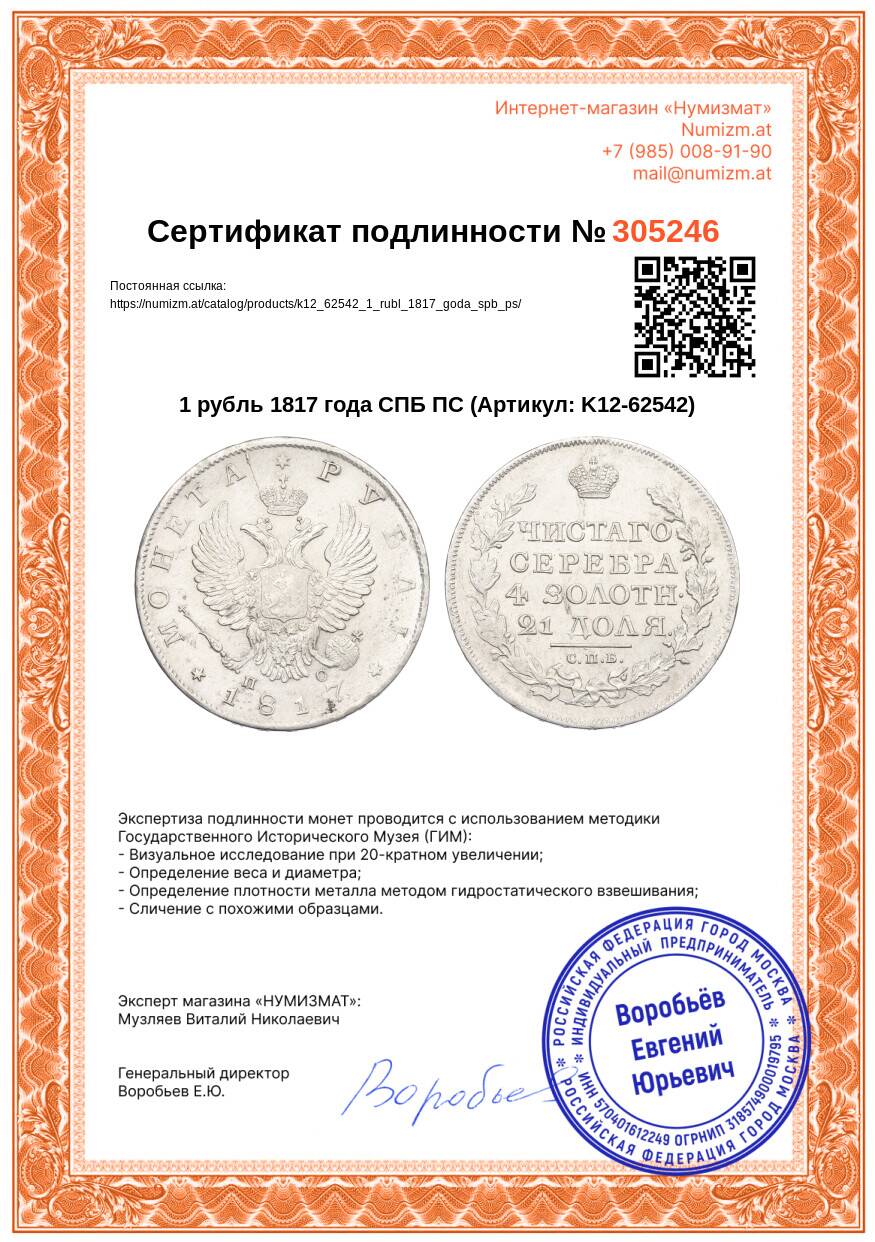 20.01.2025Интернет магазин «Нумизмат» предлагает приобрести 1 рубль 1817 года СПБ ПС.