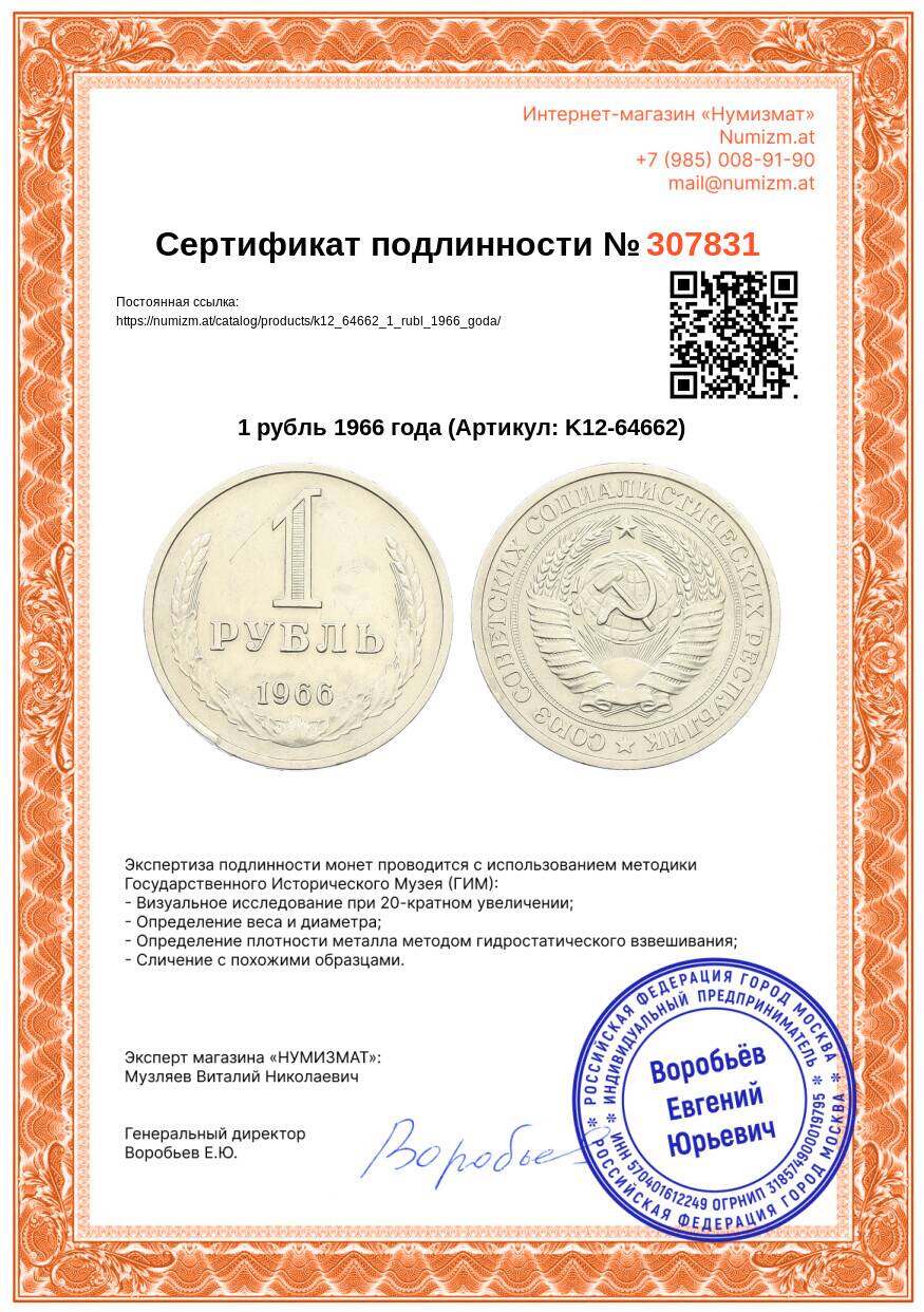 Интернет магазин «Нумизмат» предлагает приобрести 1 рубль 1966 года.